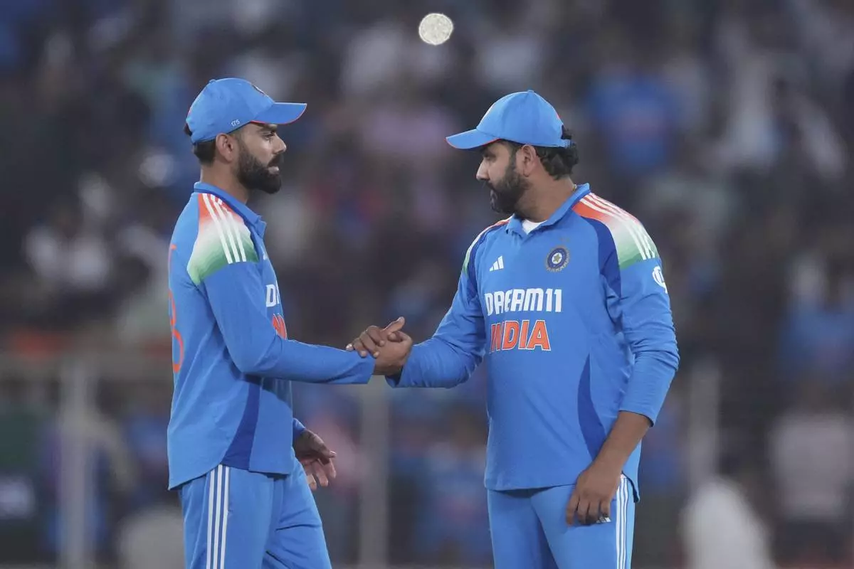 India's captain Rohit Sharma, right, and Virat Kohli celebrate after winning the third one day international cricket match and series against England in Ahmedabad, India, Wednesday, Feb. 12, 2025. (AP Photo/ Ajit Solanki )