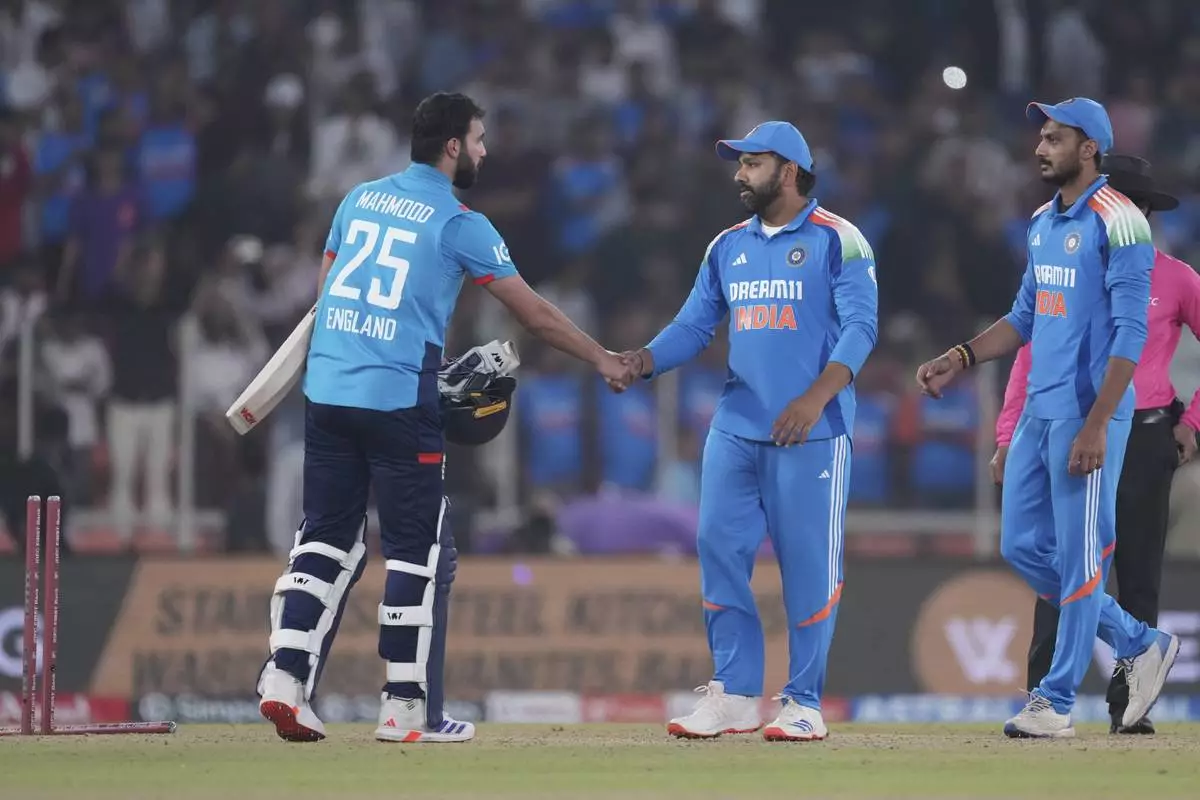 India's captain Rohit Sharma, second from right, shakes hand with England's Saqib Mahmood, left, after winning the third one day international cricket match and series against England in Ahmedabad, India, Wednesday, Feb. 12, 2025. (AP Photo/ Ajit Solanki )
