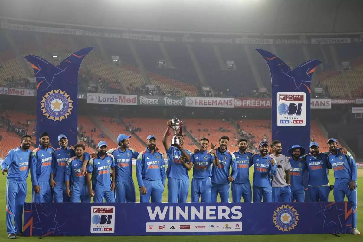 Indian players posses with the trophy after winning one day international cricket series against England in Ahmedabad, India, Wednesday, Feb. 12, 2025. (AP Photo/ Ajit Solanki )