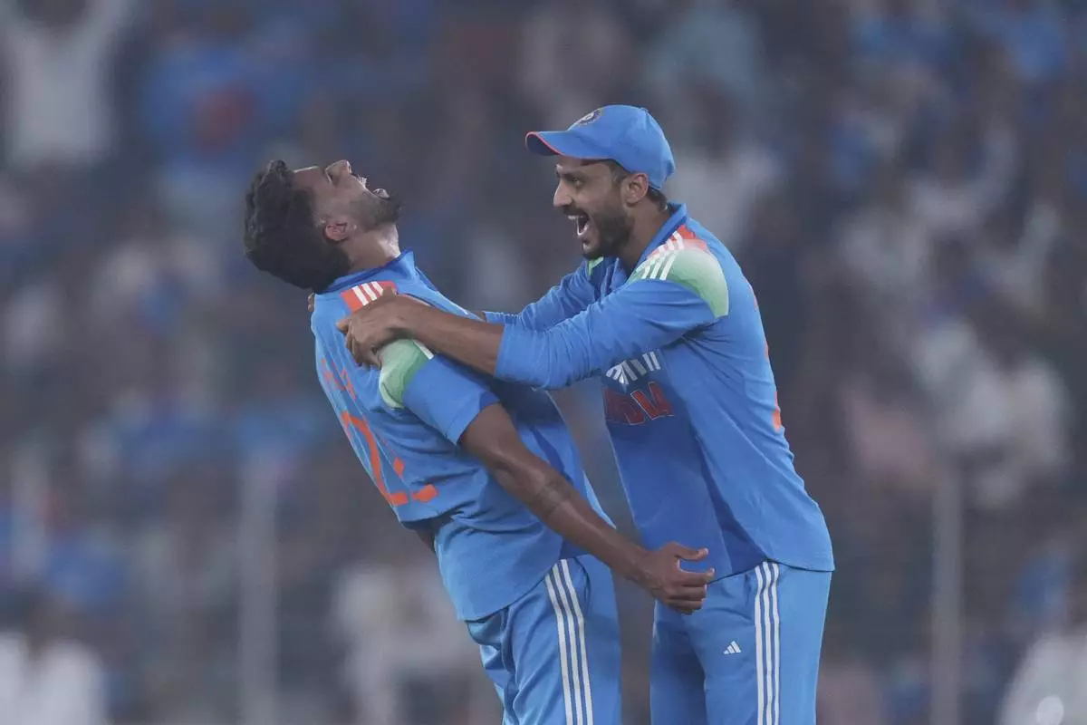 India's Harshit Rana, left, and Axar Patel, right, celebrates the wicket of England's Harry Brook during the third one day international cricket match between India and England in Ahmedabad, India, Wednesday, Feb. 12, 2025. (AP Photo/ Ajit Solanki )