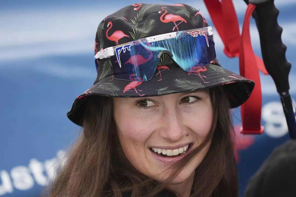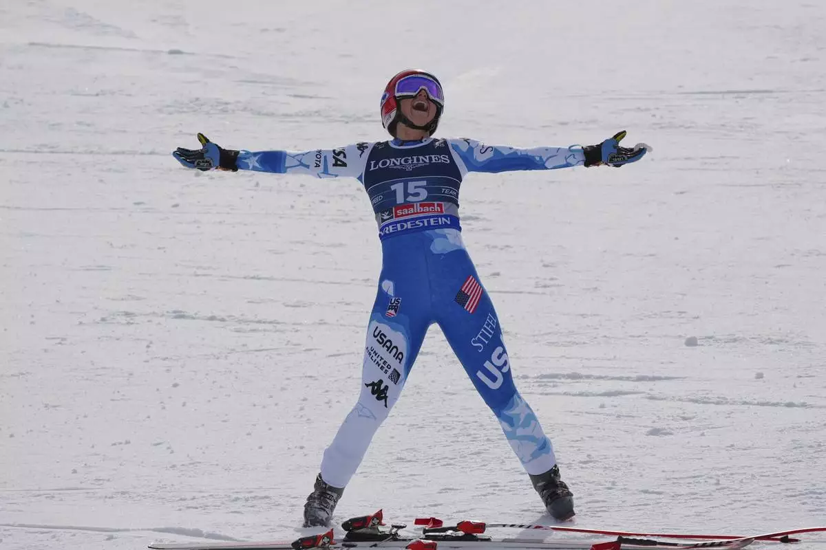 United States' Breezy Johnson at the finish area of a downhill run of a women's team combined event, at the Alpine Ski World Championships, in Saalbach-Hinterglemm, Austria, Tuesday, Feb. 11, 2025. (AP Photo/Giovanni Auletta)