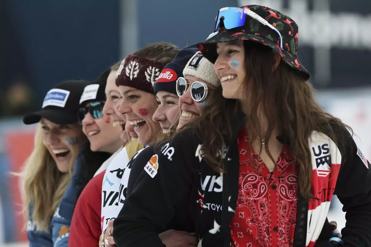 From left, United States' Paula Moltzan, Jacqueline Wiles, A.J. Hurt, Breezy Johnson, Mikaela Shiffrin, Katie Hensien and Lauren Macuga celebrates at the finish area after Johnson and Shiffrin won the gold medal in a women's team combined event, at the Alpine Ski World Championships, in Saalbach-Hinterglemm, Austria, Tuesday, Feb. 11, 2025. (AP Photo/Marco Trovati)