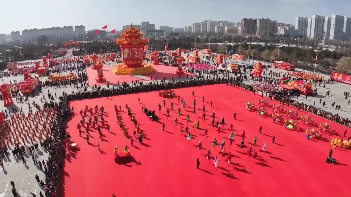 In Shanxi's Huairen City, 44 performing teams composed of more than 5,000 dressed up people staged splendid folk performances including rural Yangge dances, tricky stilts walking and "riding land boats," in which performers dance in prop boats made of paper, cloth and other materials, turning the square into a sea of festive joy.