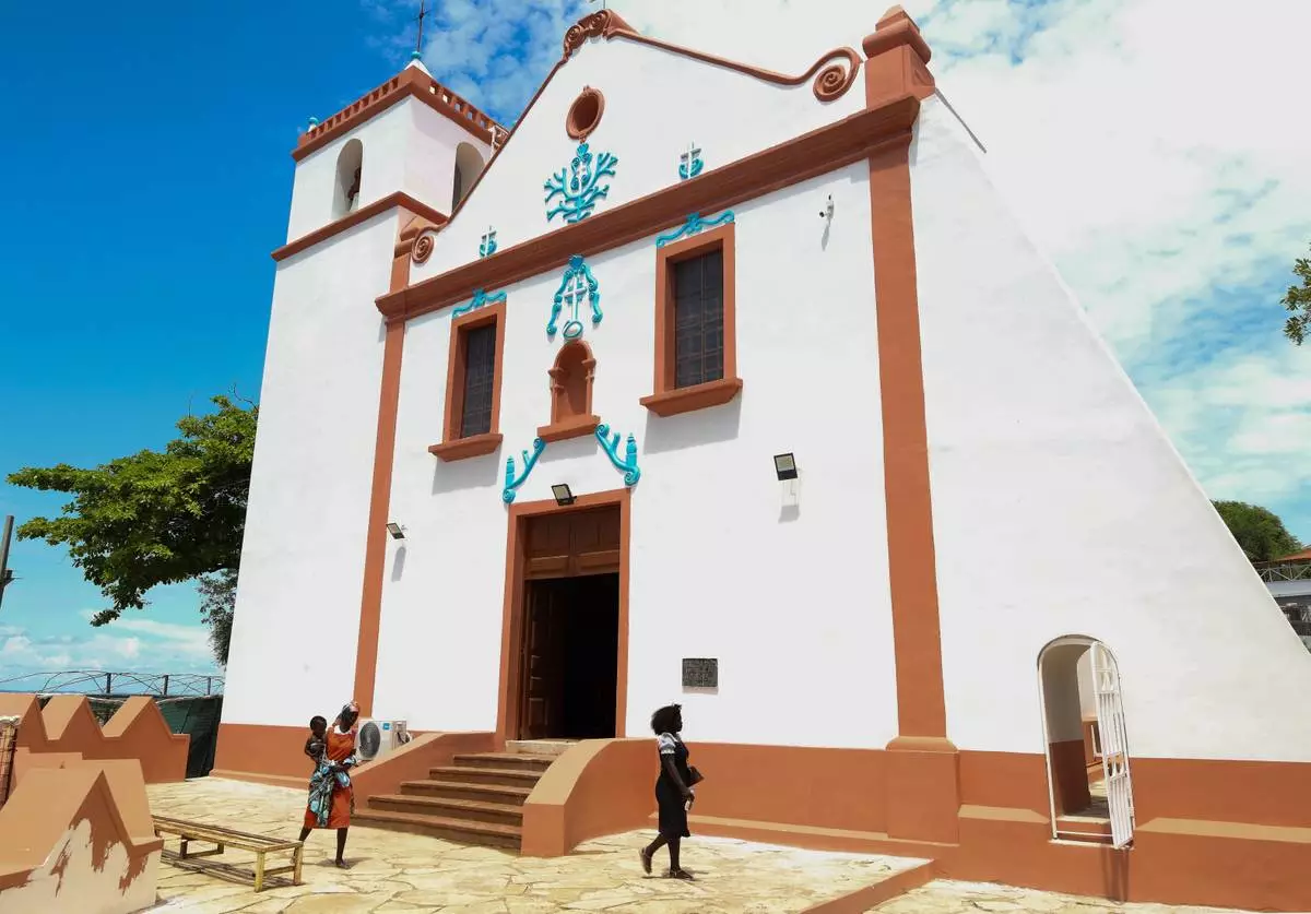People walk by the Church of Our Lady of Muxima in Muxima, Angola, Saturday, April 11, 2026, which Pope Leo XIV will visit during his 11-day pastoral visit to Africa. (AP Photo)