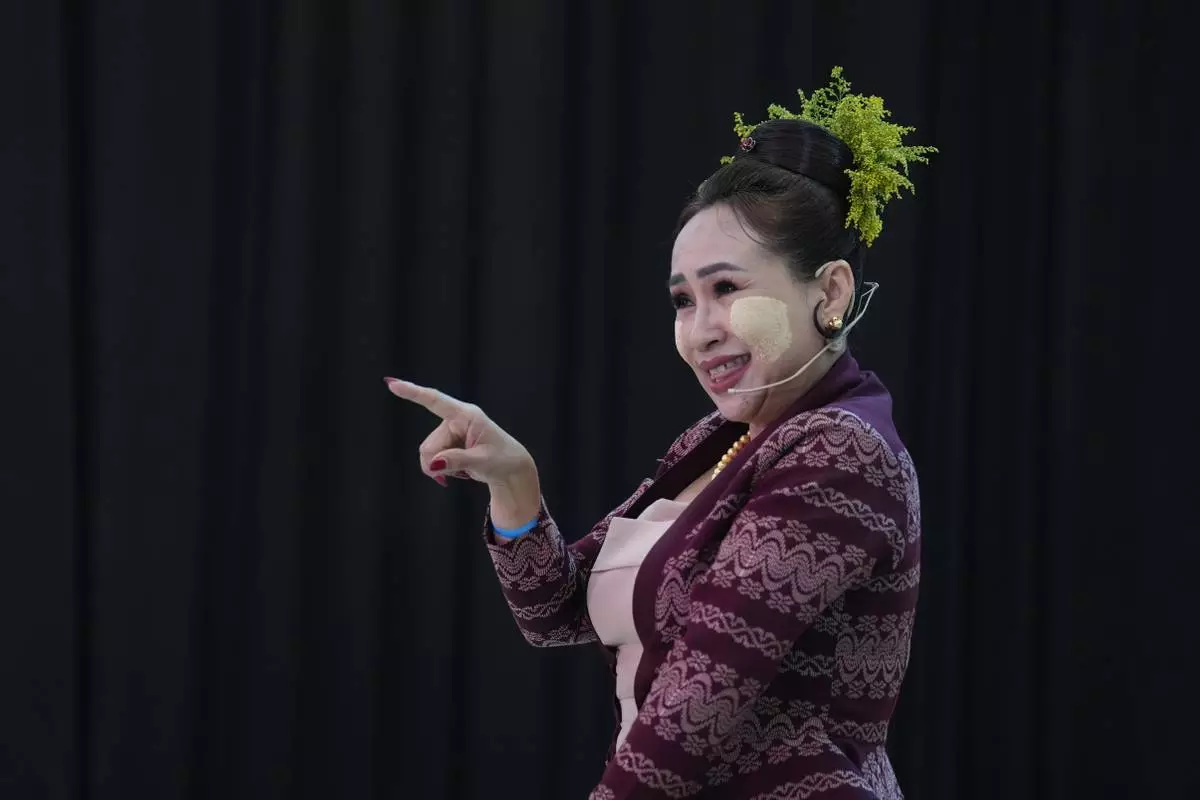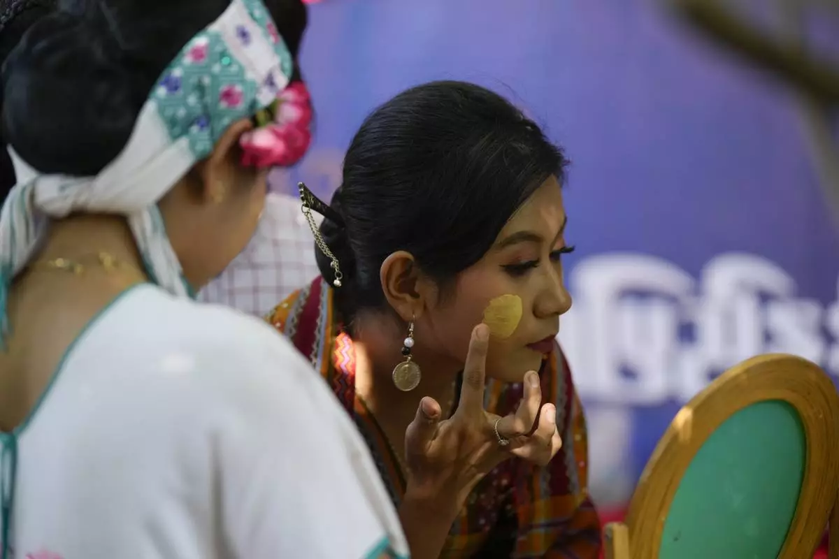 Artists with traditional attire put Thanakha, traditional make-up, on their faces as they take part in performance competition show aiming to submit the traditional culture of Thanakha to UNESCO's Intangible Cultural Heritage of Humanity, Wednesday, Feb.12, 2025 in Yangon, Myanmar. (AP Photo/Thein Zaw)