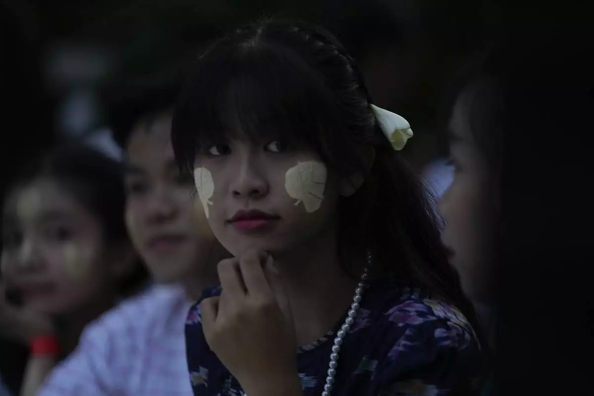 A girl puts Thanakha, traditional make-up, on her faces watches performance competition show aiming to submit the traditional culture of Thanakha to UNESCO's Intangible Cultural Heritage of Humanity, Wednesday, Feb.12, 2025 in Yangon, Myanmar. (AP Photo/Thein Zaw)