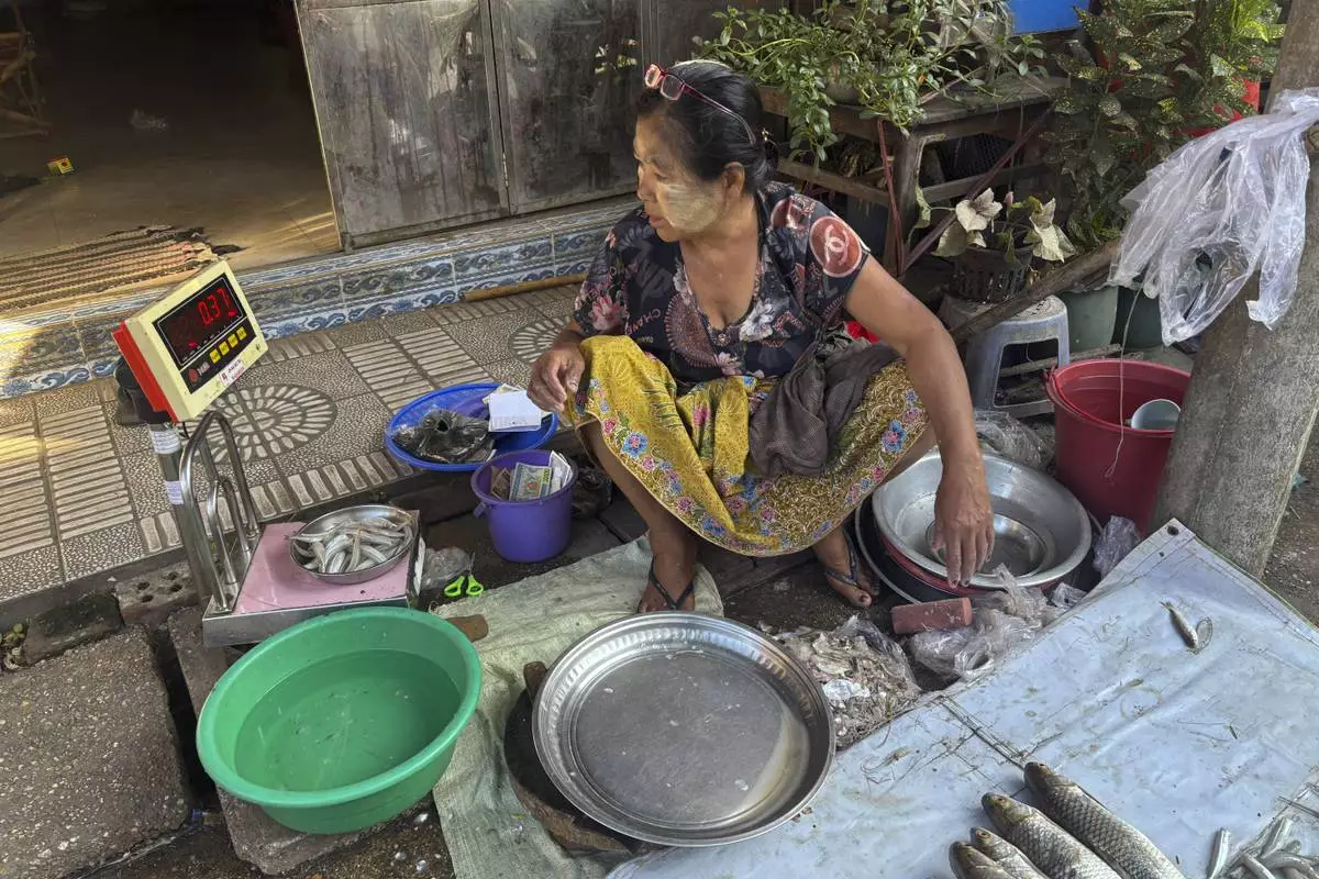 A woman puts Thanakha, traditional make-up, on her face weighs fishes to customers at a local bazaar Wednesday, Feb.12, 2025 in Yangon, Myanmar. (AP Photo/Thein Zaw)