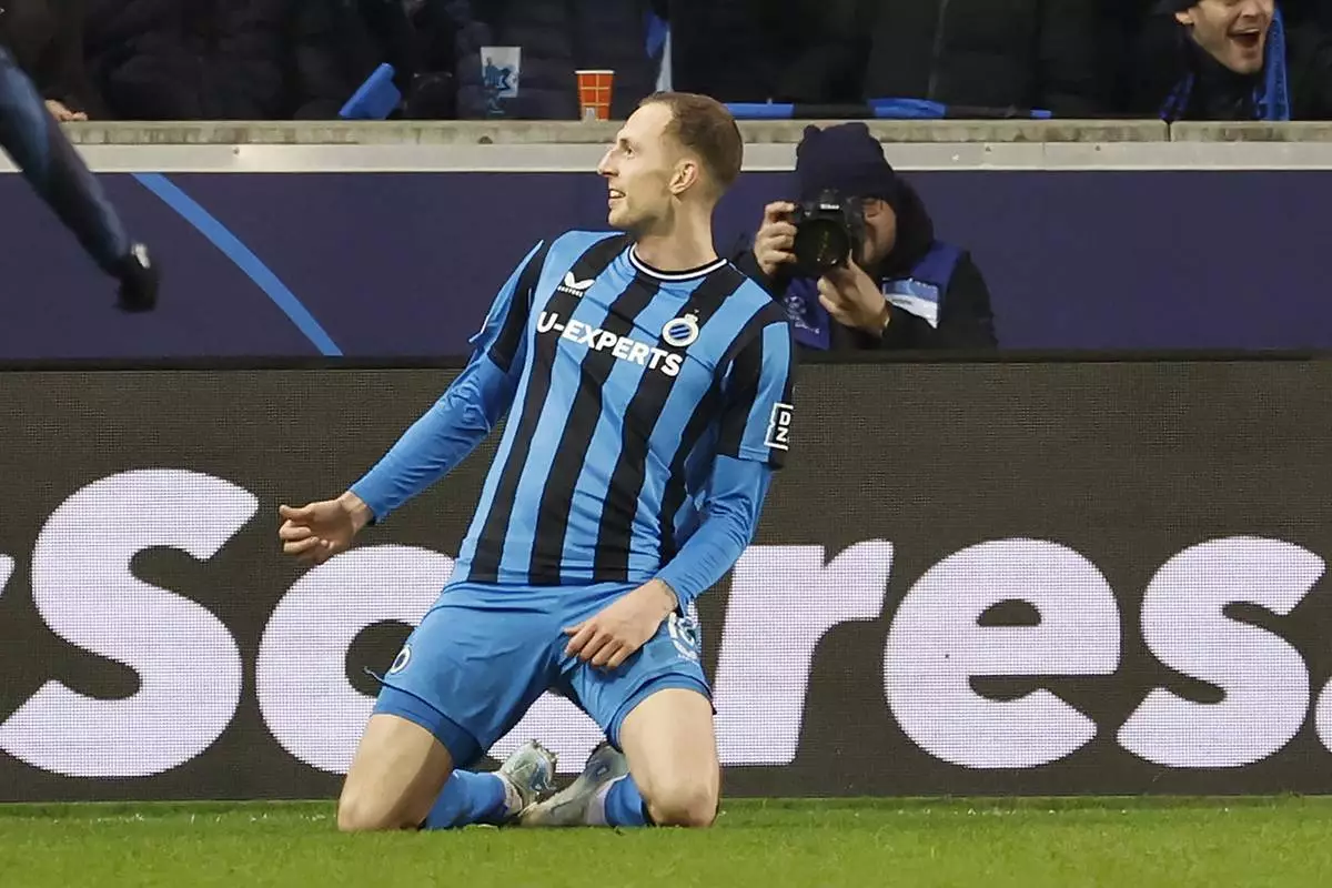 Brugge's Gustaf Nilsson celebrates after scoring the second goal from penalty against Atalanta, during the Champions League playoff first leg soccer match between Club Brugge and Atalanta at the Jan Breydel Stadium in Bruges, Belgium, Wednesday, Feb. 12, 2025. (AP Photo/Geert Vanden Wijngaert)