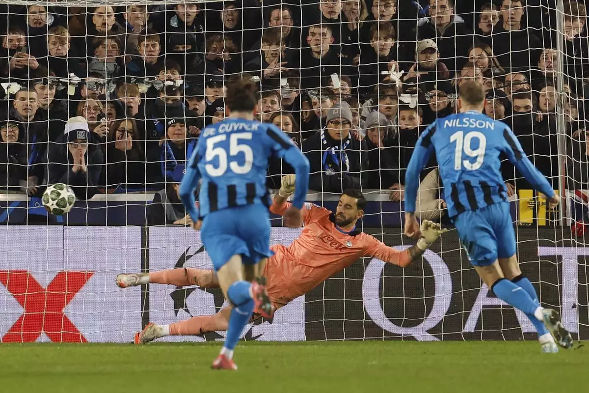 Brugge's Gustaf Nilsson, right, scores the second goal from penalty position against Atalanta, during the Champions League playoff first leg soccer match between Club Brugge and Atalanta at the Jan Breydel Stadium in Bruges, Belgium, Wednesday, Feb. 12, 2025. (AP Photo/Geert Vanden Wijngaert)