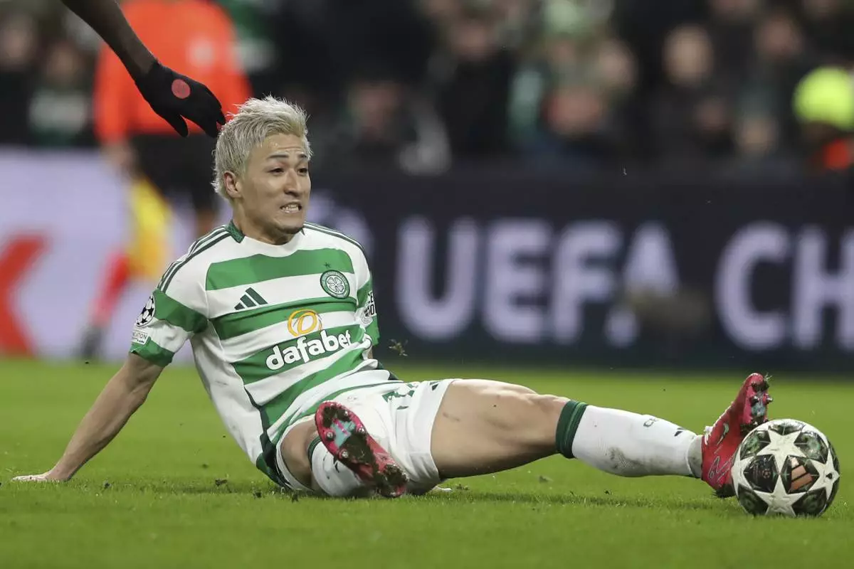 Celtic's Daizen Maeda sits on the ground during the Champions League play off first leg soccer match between Celtic Glasgow and Bayern Munich at the Celtic Park Stadium in Glasgow, Scotland, Wednesday, Feb. 12, 2025. (AP Photo/Scott Heppell)