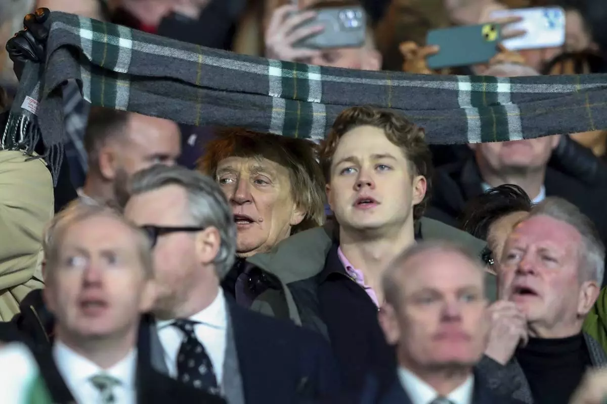 British pop icon Rod Stewart cheers the teams prior to the Champions League play off first leg soccer match between Celtic Glasgow and Bayern Munich at the Celtic Park Stadium in Glasgow, Scotland, Wednesday, Feb. 12, 2025. (AP Photo/Scott Heppell)