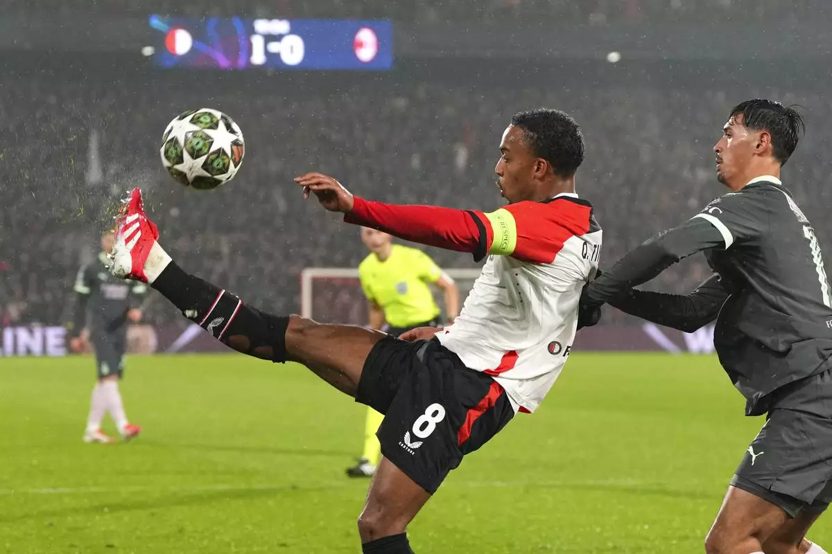 Feyenoord's Quinten Timber kicks the ball next to AC Milan's Tijjani Reijnders during the Champions League playoff first leg soccer match between Feyenoord and AC Milan, at the De Kuip stadium, in Rotterdam, Netherlands, Wednesday, Feb. 12, 2025. (AP Photo/Peter Dejong)