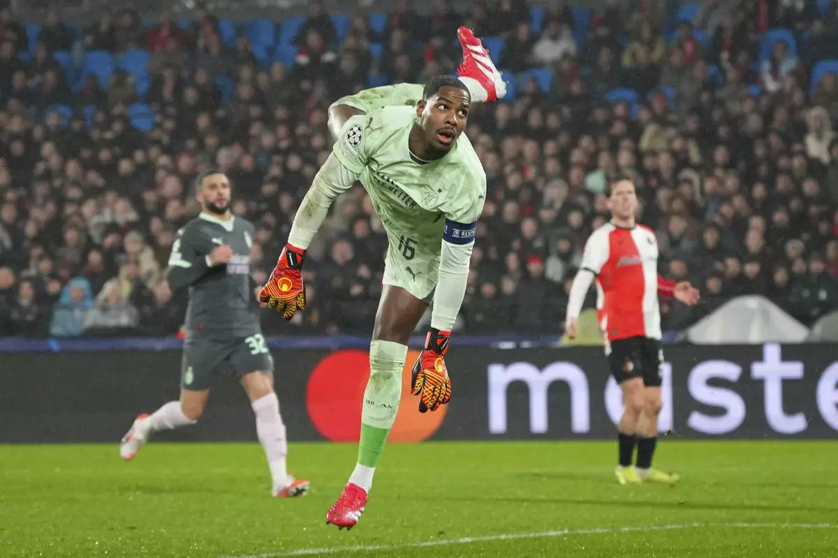 AC Milan's goalkeeper Mike Maignan dives to save a shot during the Champions League playoff first leg soccer match between Feyenoord and AC Milan, at the De Kuip stadium, in Rotterdam, Netherlands, Wednesday, Feb. 12, 2025. (AP Photo/Peter Dejong)