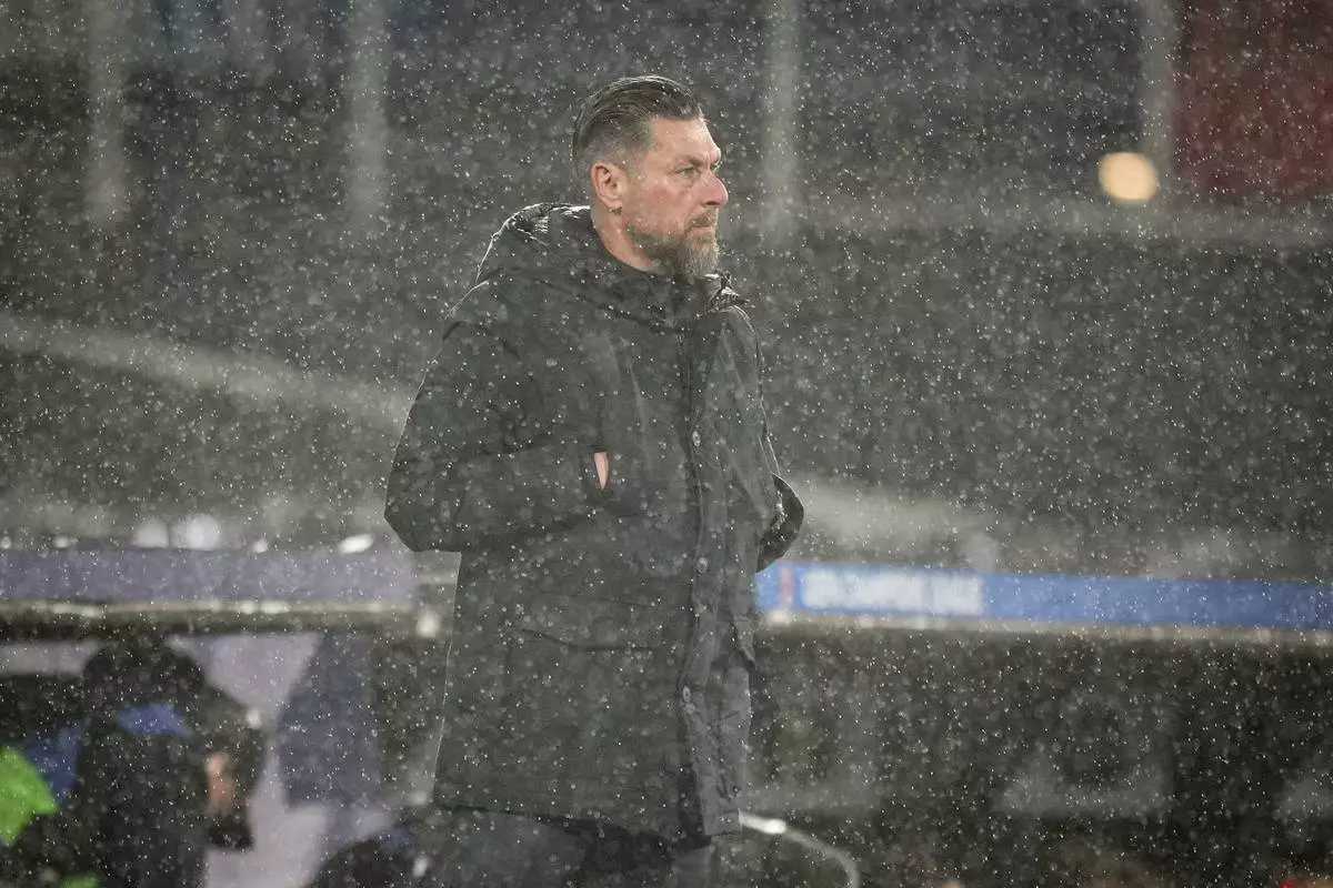Feyenoord's interim coach Pascal Bosschaart stands during the Champions League playoff first leg soccer match between Feyenoord and AC Milan, at the De Kuip stadium, in Rotterdam, Netherlands, Wednesday, Feb. 12, 2025. (AP Photo/Peter Dejong)