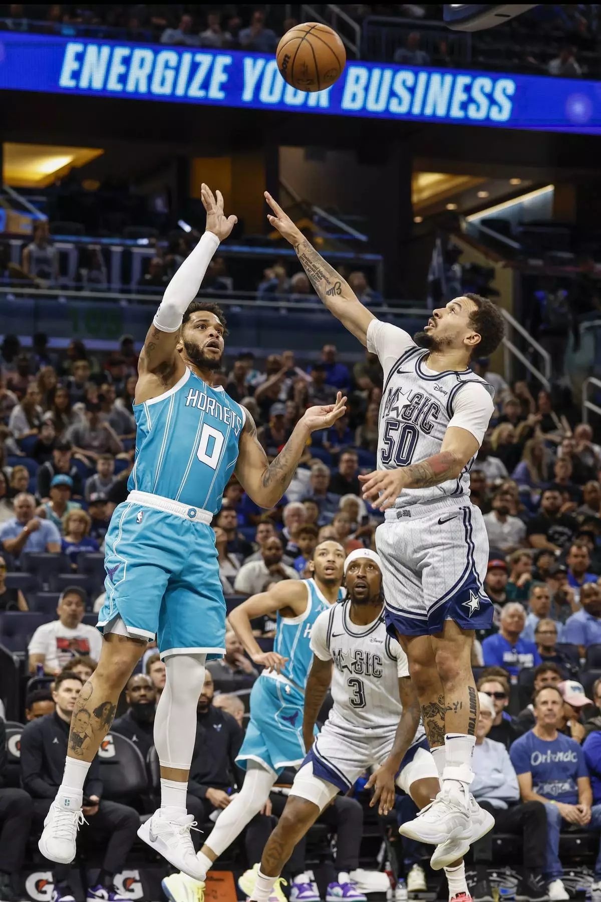 Charlotte Hornets forward Miles Bridges (0) shoots the ball over Orlando Magic guard Cole Anthony (50) during the first half of an NBA basketball game, Wednesday, Feb. 12, 2025, in Orlando, Fla. (AP Photo/Kevin Kolczynski)
