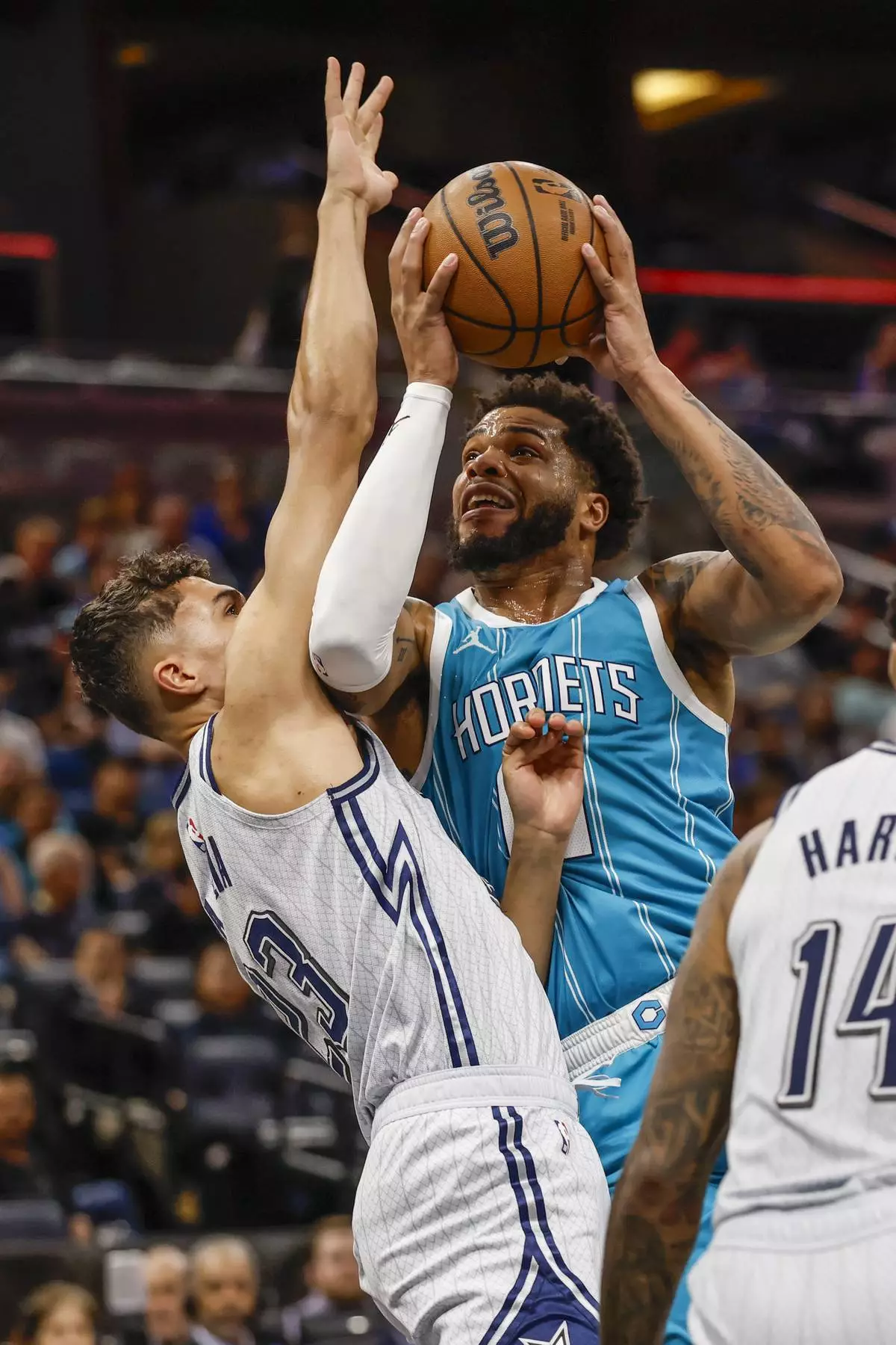 Charlotte Hornets forward Miles Bridges, right, goes up to shoot as he is defended by Orlando Magic forward Tristan da Silva, left, during the first half of an NBA basketball game, Wednesday, Feb. 12, 2025, in Orlando, Fla. (AP Photo/Kevin Kolczynski)