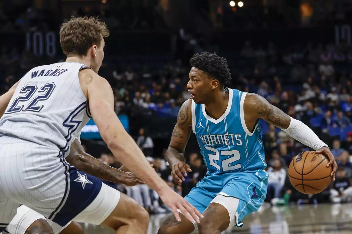 Charlotte Hornets guard Elfrid Payton is defended by Orlando Magic forward Franz Wagner (22) during the first half of an NBA basketball game, Wednesday, Feb. 12, 2025, in Orlando, Fla. (AP Photo/Kevin Kolczynski)