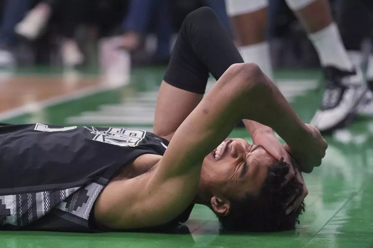 San Antonio Spurs center Victor Wembanyama grabs his head after getting knocked to the floor against the Boston Celtics during the first half of an NBA basketball game, Wednesday, Feb. 12, 2025, in Boston. (AP Photo/Charles Krupa)