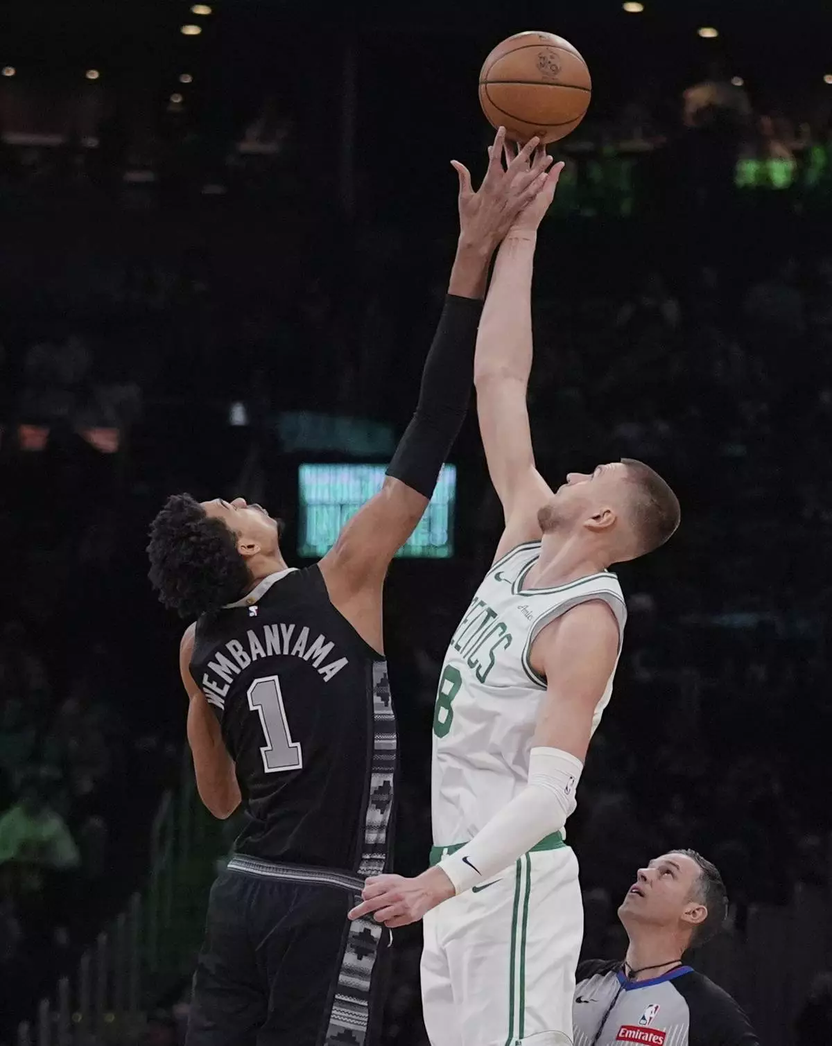 Boston Celtics center Kristaps Porzingis, right, battles for the opening tip against San Antonio Spurs center Victor Wembanyama (1) during the first half of an NBA basketball game, Wednesday, Feb. 12, 2025, in Boston. (AP Photo/Charles Krupa)