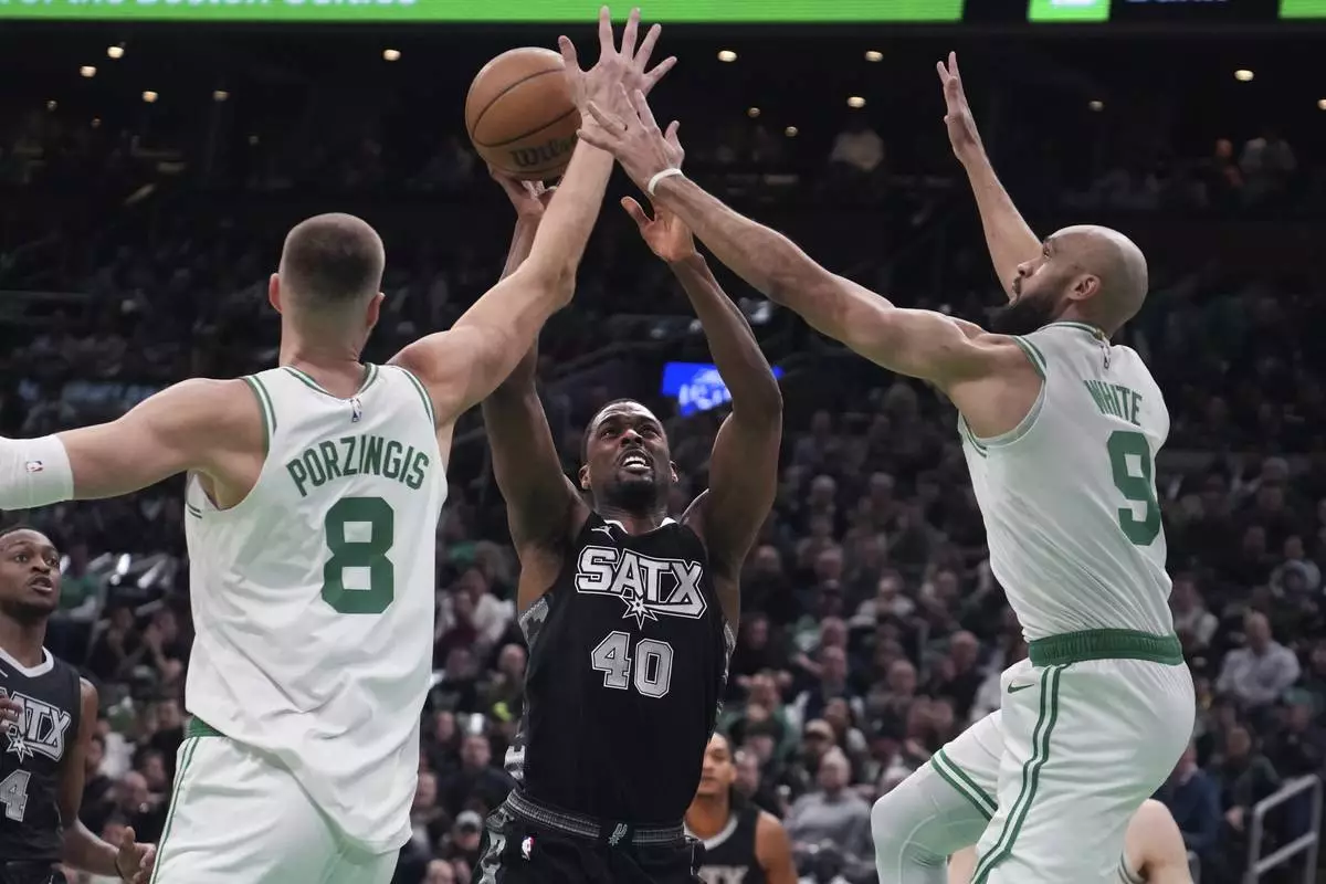 San Antonio Spurs forward Harrison Barnes (40) is covered by Boston Celtics center Kristaps Porzingis (8) and guard Derrick White (9) on a drive to the basket during the first half of an NBA basketball game, Wednesday, Feb. 12, 2025, in Boston. (AP Photo/Charles Krupa)