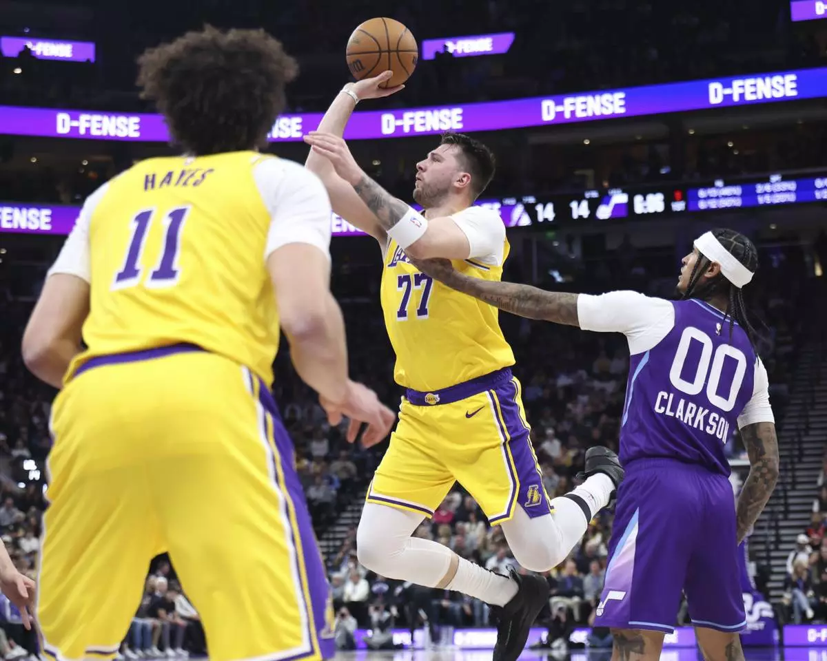 Los Angeles Lakers guard Luka Doncic (77) shoots over Utah Jazz forward Lauri Markkanen (23) and guard Jordan Clarkson (00) during the first quarter of an NBA basketball game, Wednesday, Feb. 12, 2025, in Salt Lake City. (AP Photo/Rob Gray)