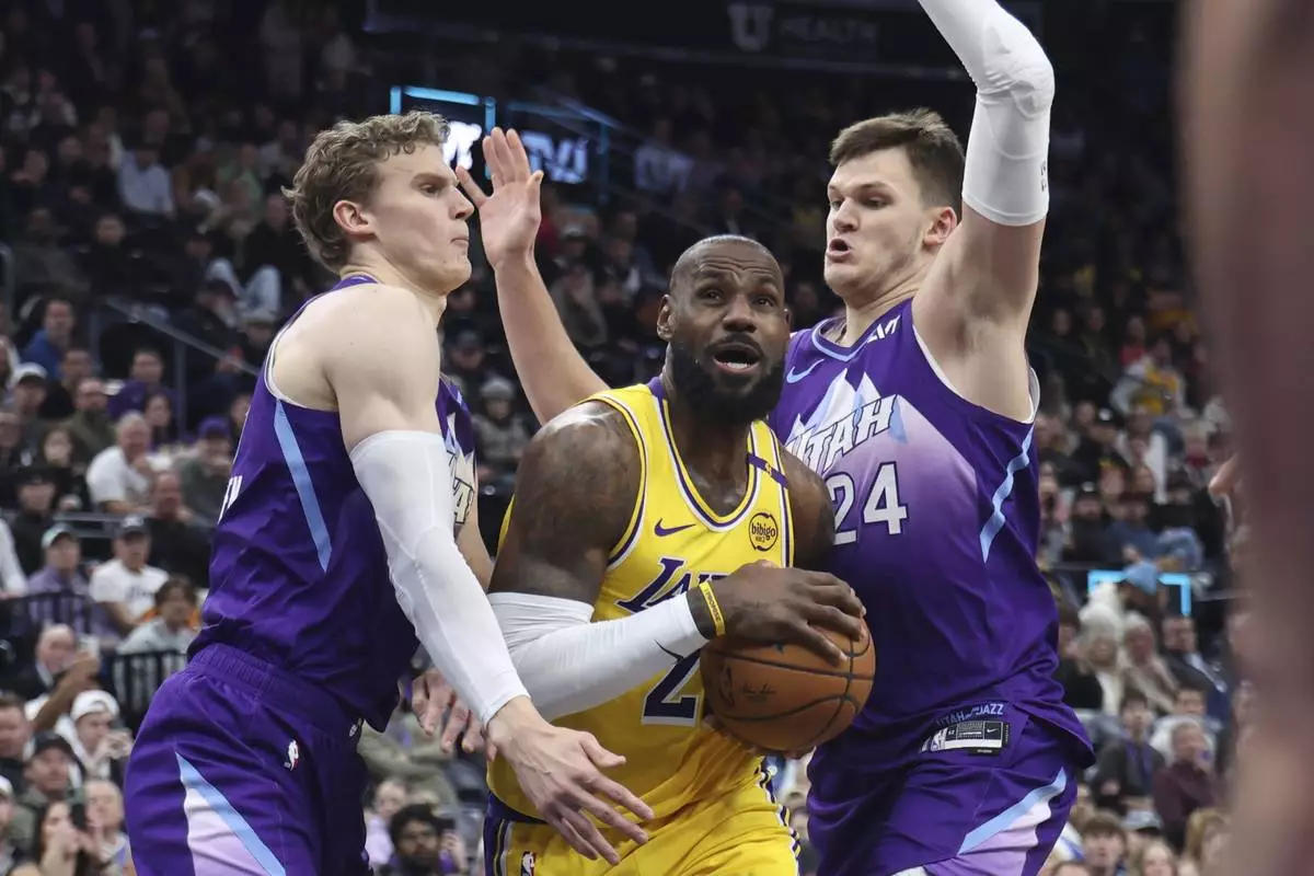 Los Angeles Lakers forward LeBron James, middle, drives between Utah Jazz forward Lauri Markkanen, left, and center Walker Kessler (24) during the first quarter of an NBA basketball game, Wednesday, Feb. 12, 2025, in Salt Lake City. (AP Photo/Rob Gray)