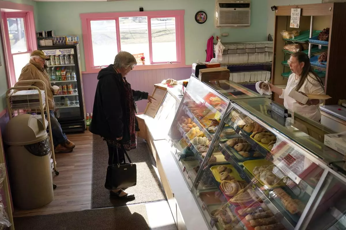 FILE - A customer holds the door for a family arriving at Leavitt's Country Bakery in this April 13, 2023 file photo, in Conway, N.H. (AP Photo/Robert F. Bukaty, file)
