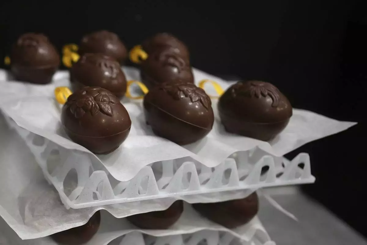 Chocolate eggs dry in the workshop at The Chocolate Line in Bruges, Belgium, Thursday, Feb. 6, 2025. (AP Photo/Virginia Mayo)