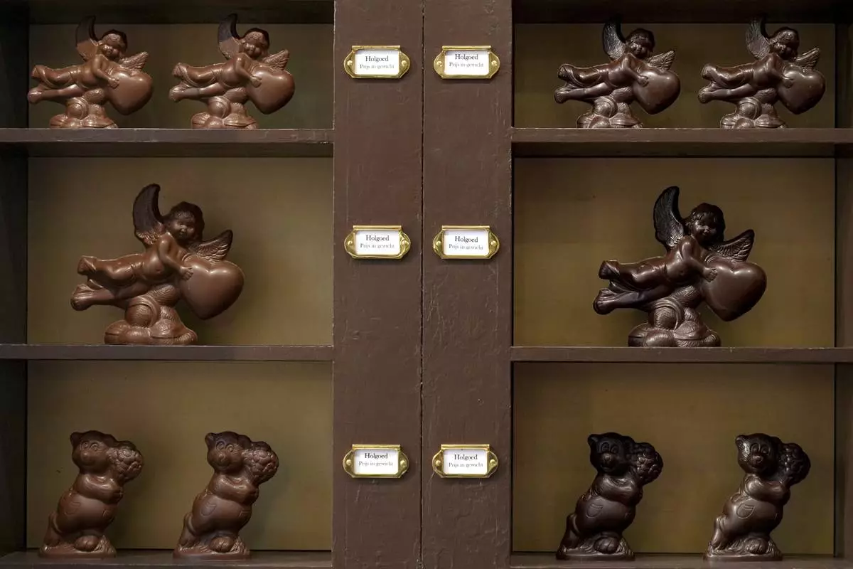 Chocolate angels and other figures for sale line a shelf at The Chocolate Line in Bruges, Belgium, Thursday, Feb. 6, 2025. (AP Photo/Virginia Mayo)
