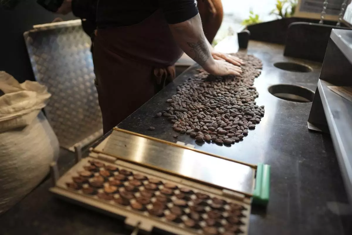 Artisan chocolatier Dominique Persoone sorts through cocoa beans in his workshop at The Chocolate Line, in Bruges, Belgium, Thursday, Feb. 6, 2025. (AP Photo/Virginia Mayo)