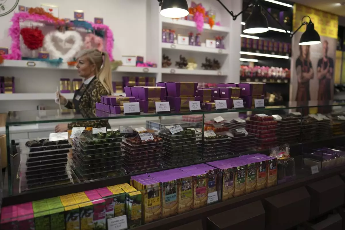 A saleswoman walks by boxes of artisan chocolates at The Chocolate Line in Bruges, Belgium, Thursday, Feb. 6, 2025. (AP Photo/Virginia Mayo)