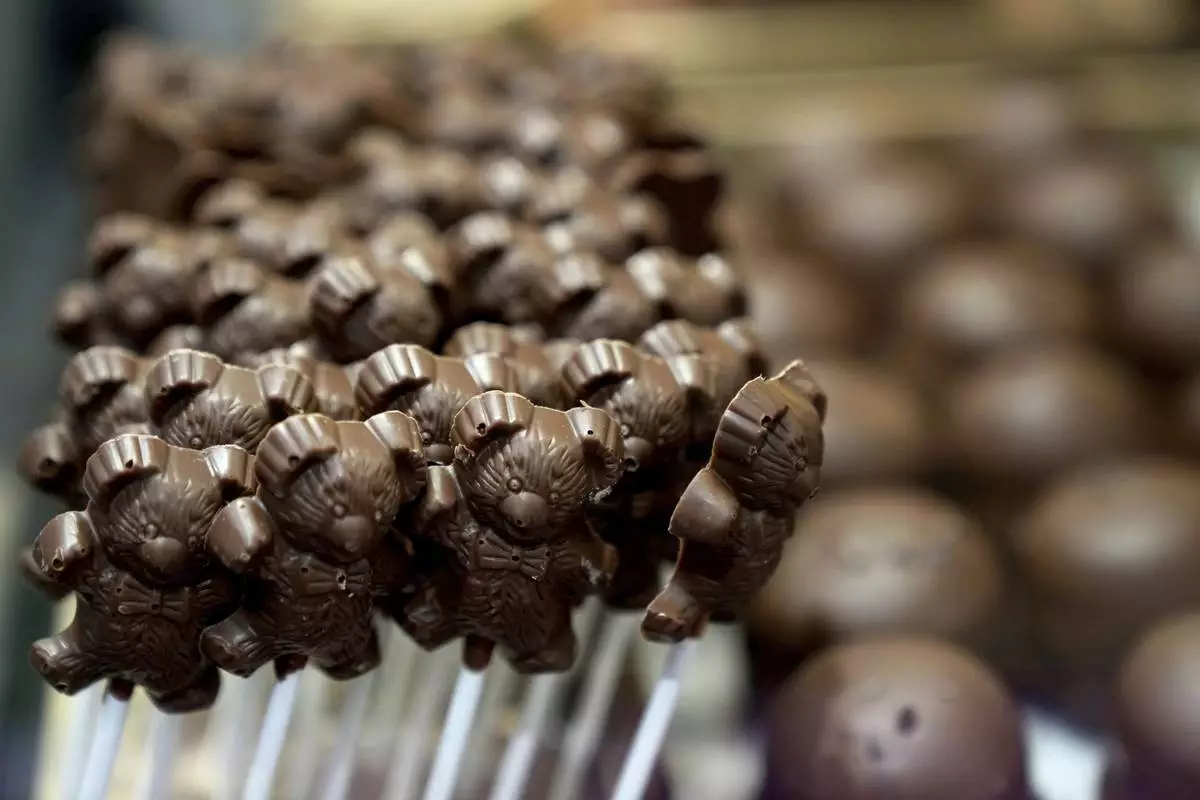 Chocolate lollypops are displayed in a glass sales case at The Chocolate Line in Bruges, Belgium, Thursday, Feb. 6, 2025. (AP Photo/Virginia Mayo)