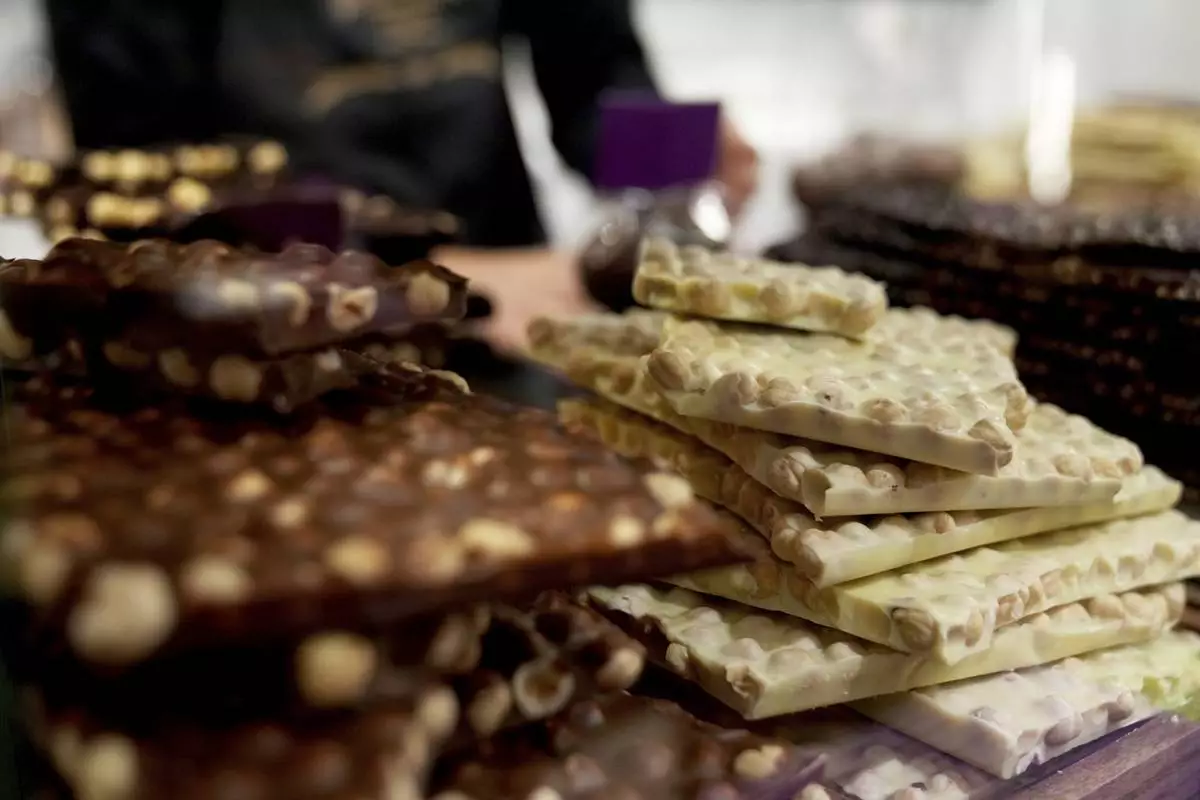 Chocolate bark is on display behind a glass counter at The Chocolate Line in Bruges, Belgium, Thursday, Feb. 6, 2025. (AP Photo/Virginia Mayo)