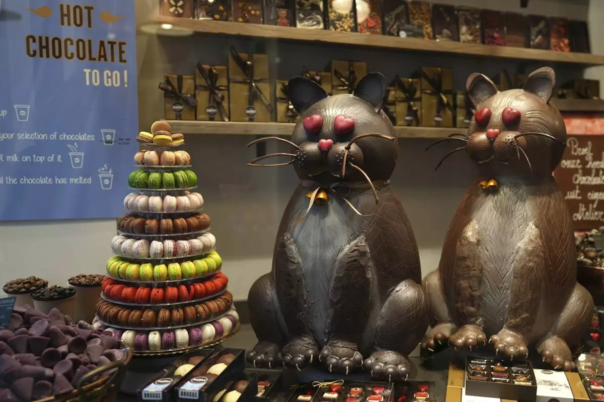 Two large cats made of Chocolate are on display in a window in Bruges, Belgium, Thursday, Feb. 6, 2025. (AP Photo/Virginia Mayo)