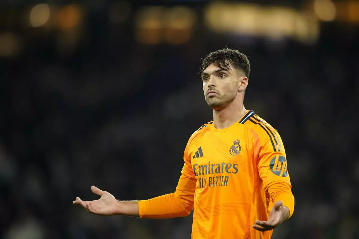 Real Madrid's Raul Asencio gestures during the Champions League playoff first leg soccer match between Manchester City and Real Madrid at the Etihad Stadium in Manchester, England, Tuesday, Feb. 11, 2025. (AP Photo/Dave Thompson)