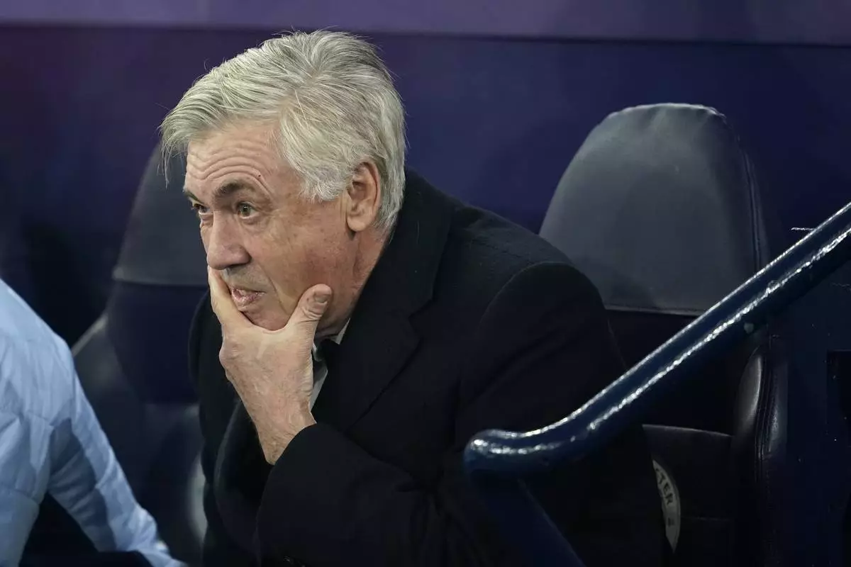 Real Madrid's head coach Carlo Ancelotti grimaces before the start of the Champions League playoff first leg soccer match between Manchester City and Real Madrid at the Etihad Stadium in Manchester, England, Tuesday, Feb. 11, 2025. (AP Photo/Dave Thompson)