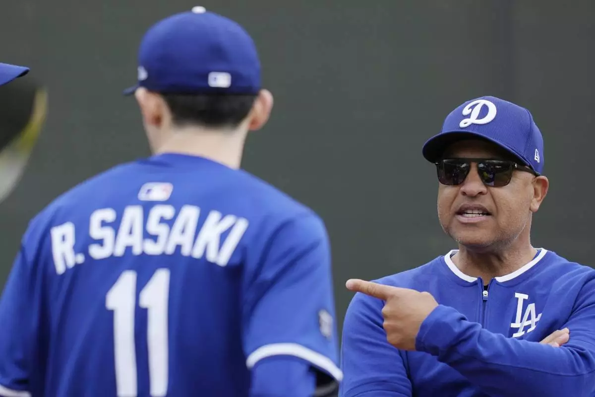 Los Angeles Dodgers manager Dave Roberts, right, talks with pitcher Roki Sasaki, of Japan, (11) at the team's baseball spring training facility Wednesday, Feb. 12, 2025, in Phoenix. (AP Photo/Ross D. Franklin)