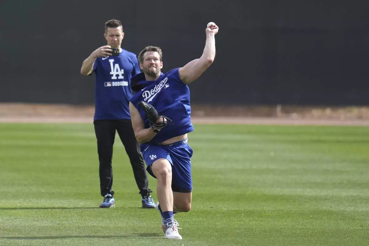 Los Angeles Dodgers pitcher Clayton Kershaw warms up at the Dodgers baseball spring training facility, Tuesday, Feb. 11, 2025, in Phoenix. (AP Photo/Ross D. Franklin)