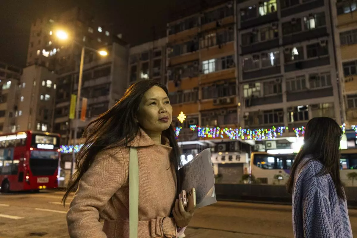 Sze Lai-shan, the deputy director of the Society for Community Organization, walks on her way to visit residents in the subdivided flat in Sham Shui Po district of Hong Kong, on Feb. 6, 2025. (AP Photo/Chan Long Hei)