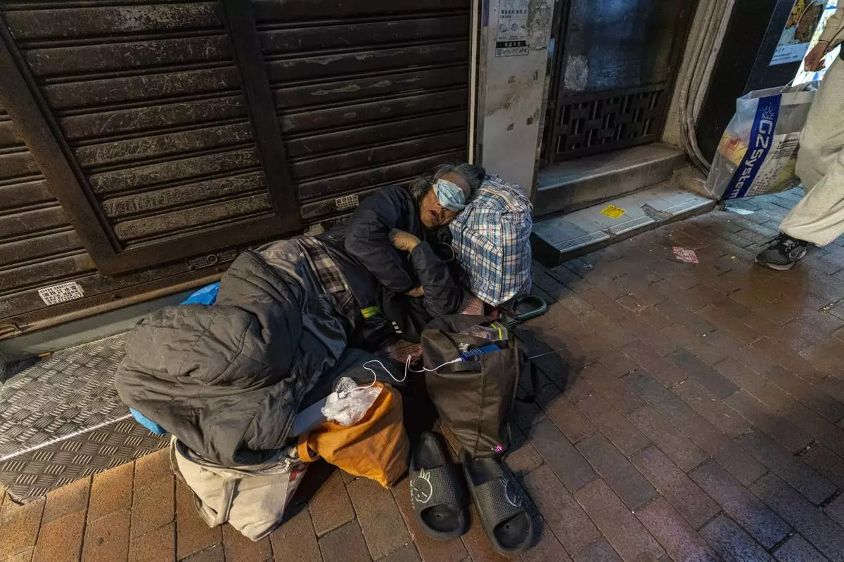 A homeless person sleeps on a street in Sham Shui Po district of Hong Kong, on Feb. 6, 2025. (AP Photo/Chan Long Hei)