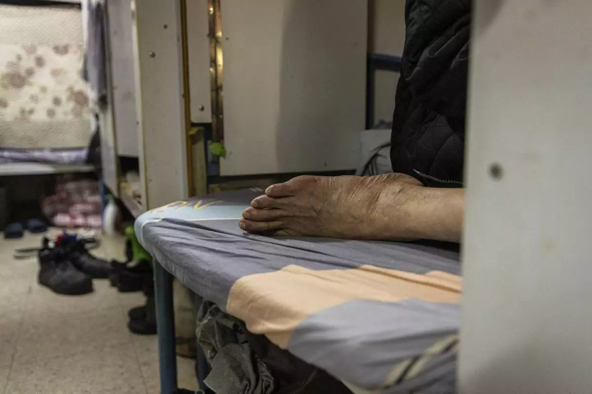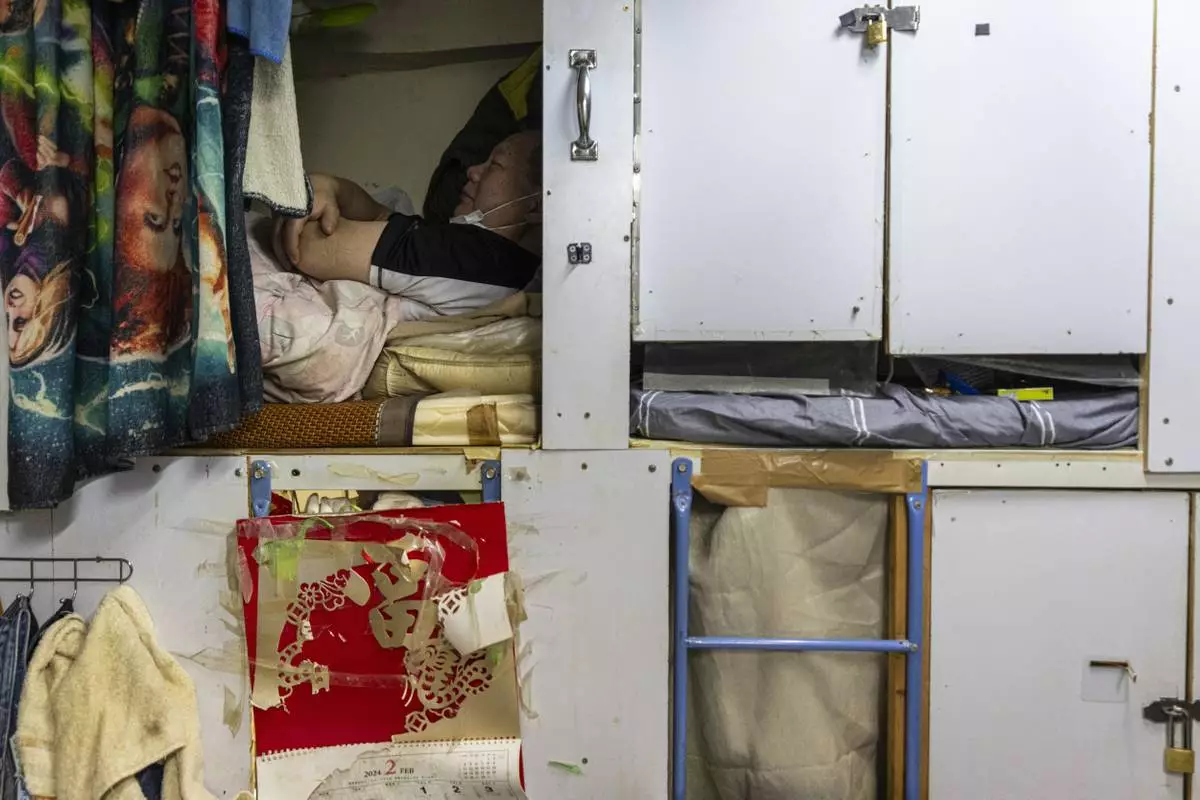 A resident rests in his bed space in Sham Shui Po district of Hong Kong, on Feb. 6, 2025. (AP Photo/Chan Long Hei)