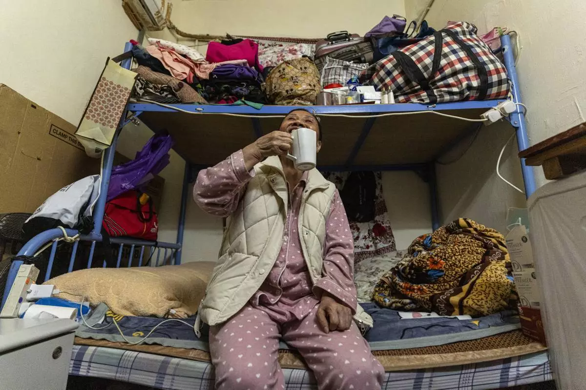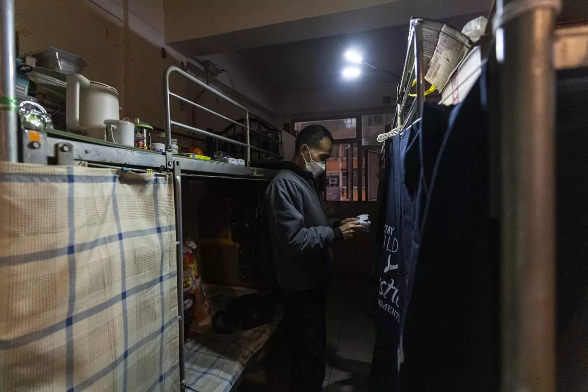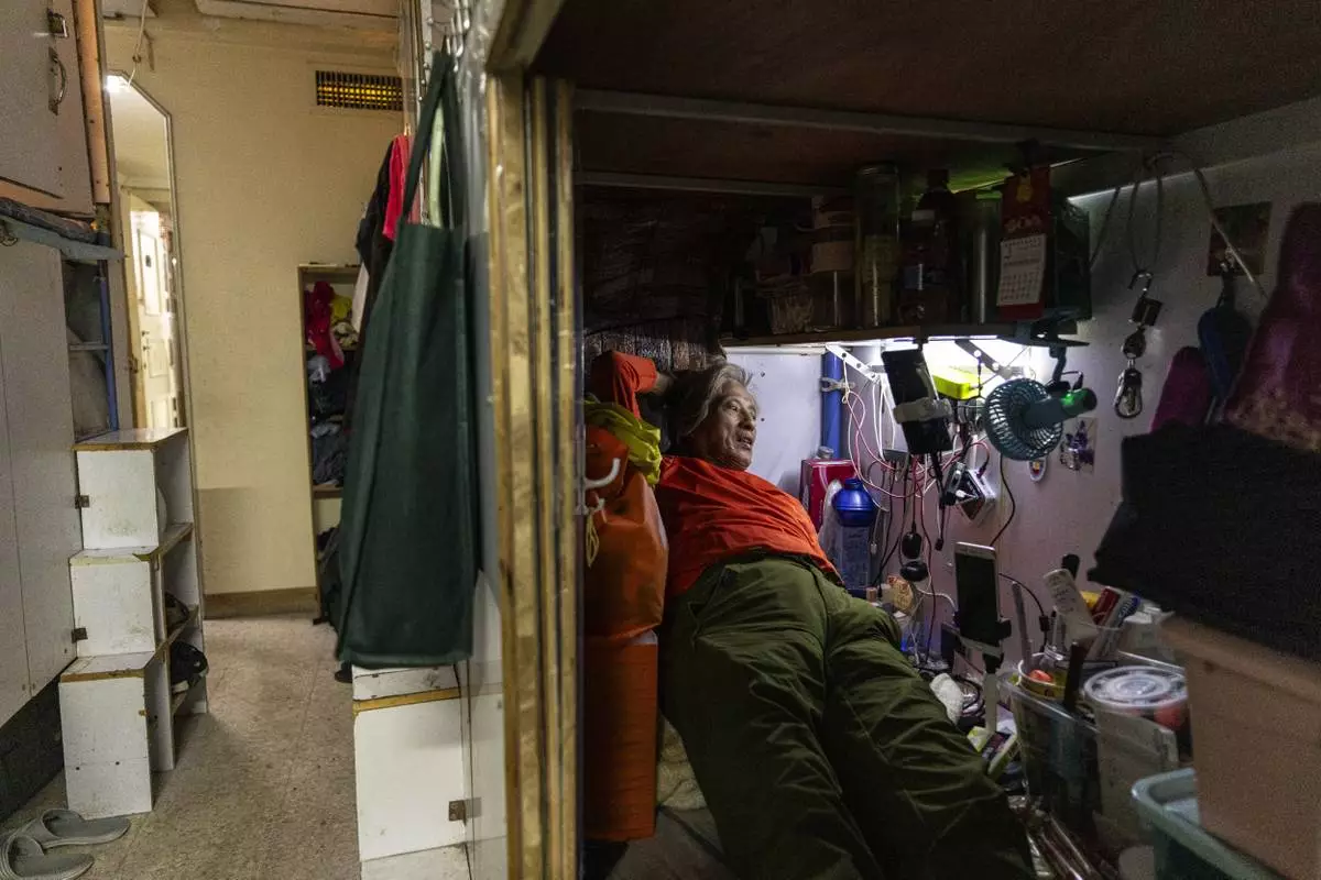 Resident Chung Shing-sun stands near his bed space in Sham Shui Po district of Hong Kong, on Feb. 6, 2025. (AP Photo/Chan Long Hei)