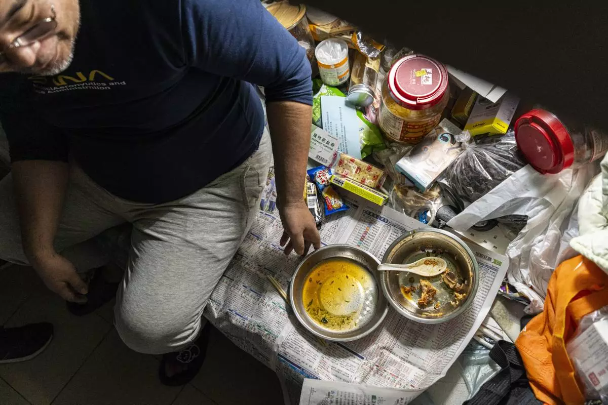 Resident Law Chung-yu has dinner in his bed space in Sham Shui Po district of Hong Kong, on Feb. 6, 2025. (AP Photo/Chan Long Hei)