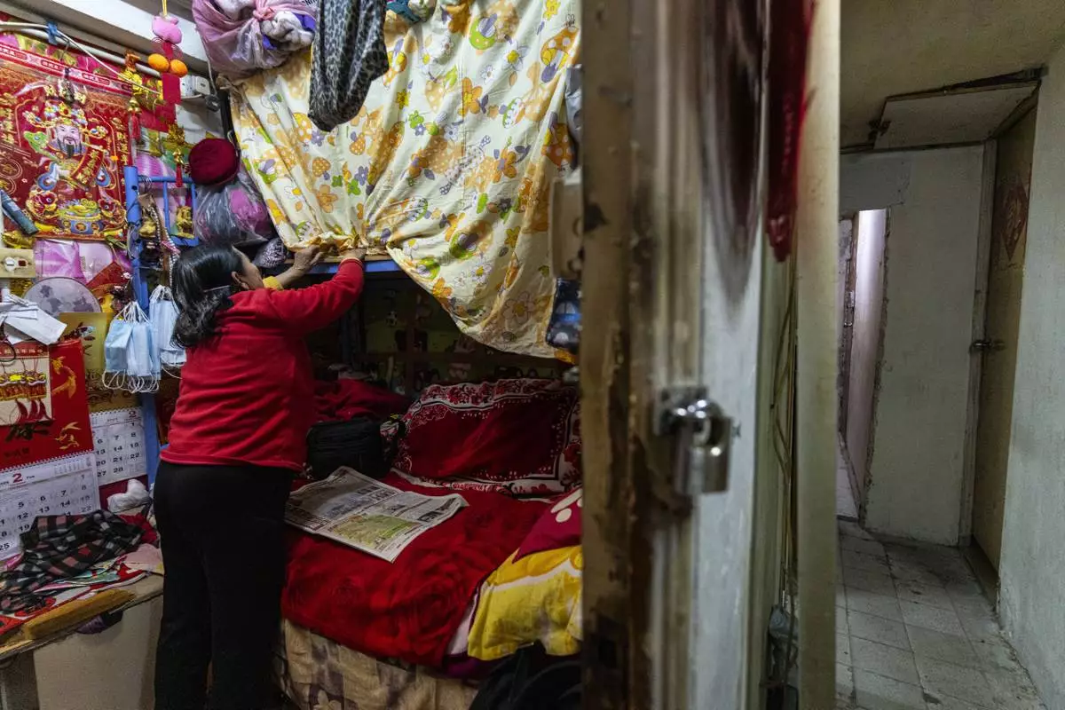 A resident adjusts the curtains over a bed at her subdivided flat in Sham Shui Po district of Hong Kong, on Feb. 6, 2025. (AP Photo/Chan Long Hei)