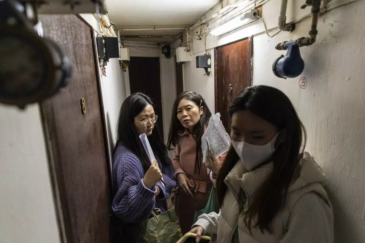 Sze Lai-shan, the deputy director of the Society for Community Organization, center, and her colleagues visit residents in the subdivided flat in Sham Shui Po district of Hong Kong, on Feb. 6, 2025. (AP Photo/Chan Long Hei)