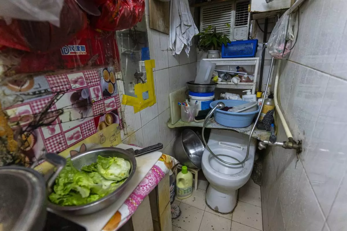 A toilet and kitchen are located in the same area of a subdivided flat in Sham Shui Po district of Hong Kong, on Feb. 6, 2025. (AP Photo/Chan Long Hei)