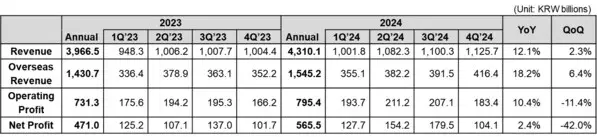 - The company's FY2024 annual revenue totaled KRW 4,310.1 billion (+8.7% YoY) with an operating profit of KRW 795.4 billion (+8.8% YoY)
