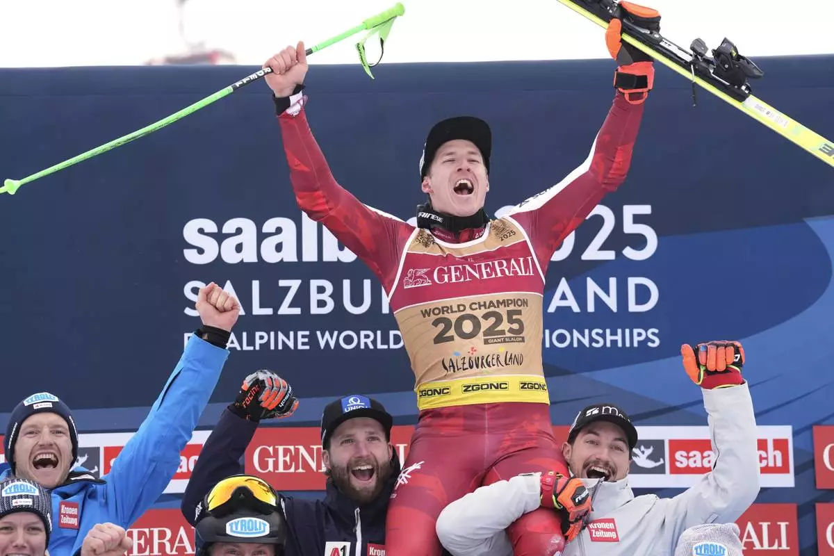 Austria's Raphael Haaser celebrates with team after winning the gold medal in a men's giant slalom, at the Alpine Ski World Championships, in Saalbach-Hinterglemm, Austria, Friday, Feb. 14, 2025. (AP Photo/Giovanni Auletta)