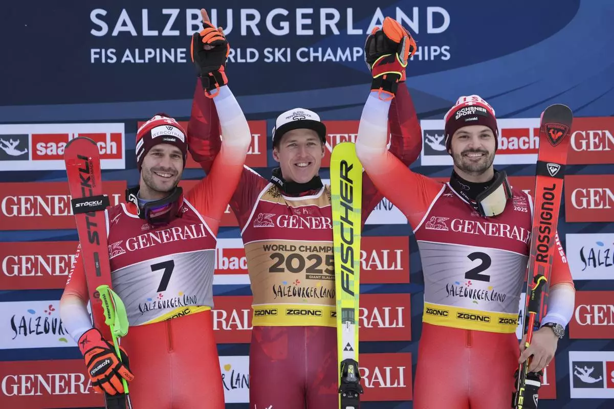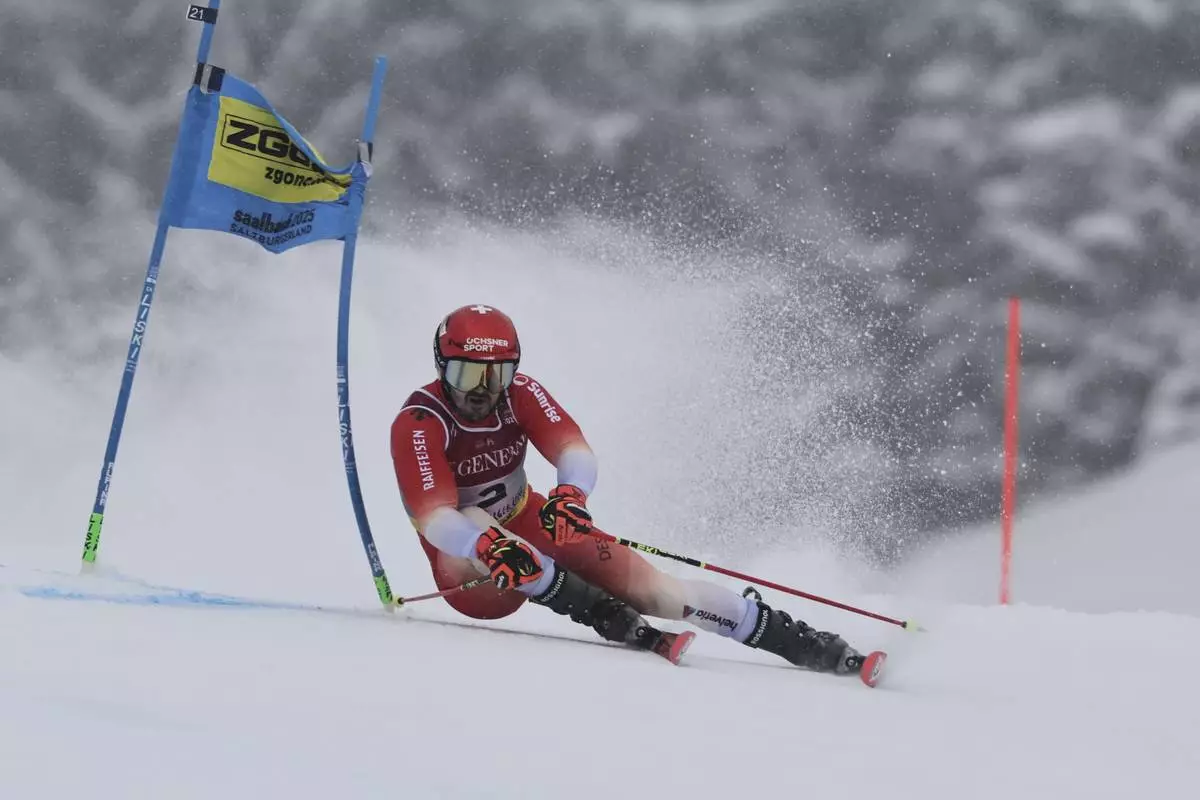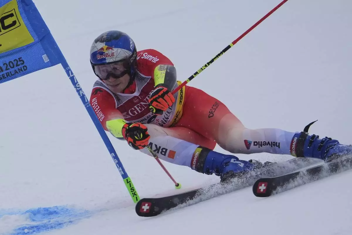 Switzerland's Loic Meillard competes in a men's giant slalom, at the Alpine Ski World Championships, in Saalbach-Hinterglemm, Austria, Friday, Feb. 14, 2025. (AP Photo/Marco Trovati)