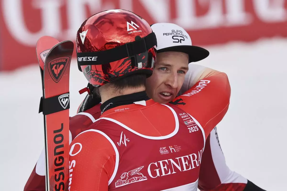 Switzerland's Loic Meillard, back to camera, hugs Austria's Raphael Haaser after he won the gold medal in a men's giant slalom, at the Alpine Ski World Championships, in Saalbach-Hinterglemm, Austria, Friday, Feb. 14, 2025. (AP Photo/Marco Trovati)